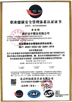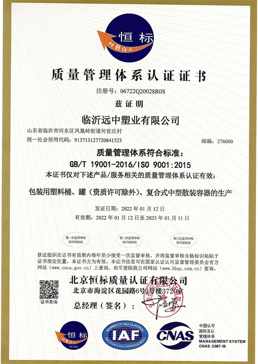 為保證產品質量達標,使管理規范化、程序化,公司于2017年5月獲通過了 ISO9001:2015中國質量體系認證;2017年3月獲得了《全國工業生產許可證》; 2017年9月通過了中華人民共和國江蘇出入境檢驗檢疫局《出口危險貨 物包裝容器質量許可證》認證,于2019年8月獲得由中國船級社簽發的型式